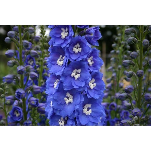 Delphinium Pacific Giant Blue Bird is a perennial variety that is early to flower and grows to a height of 1.8m. It produces Bright Blue Flowers with a White Bee. Attractive to Bees. Ideal for Borders.
